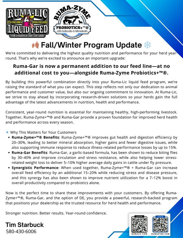 Balancing nutrition with probiotics like Ruma-Zyme, garlic through Ruma-Gar, and DE can help reduce enzyme levels, promote liver health, and support muscle function — ensuring your herd stays healthy, resilient, & productive.